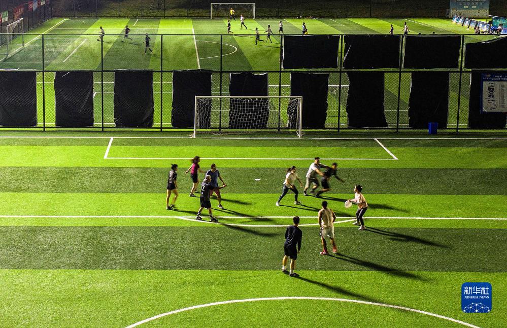 市民在成都市錦江體育公園足球場(chǎng)里玩飛盤(pán)(7月13日攝)。