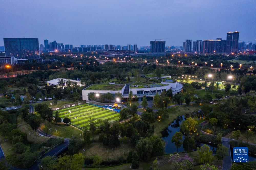 市民在成都天府新區20號足球主題運動(dòng)公園踢足球(7月13日攝)。