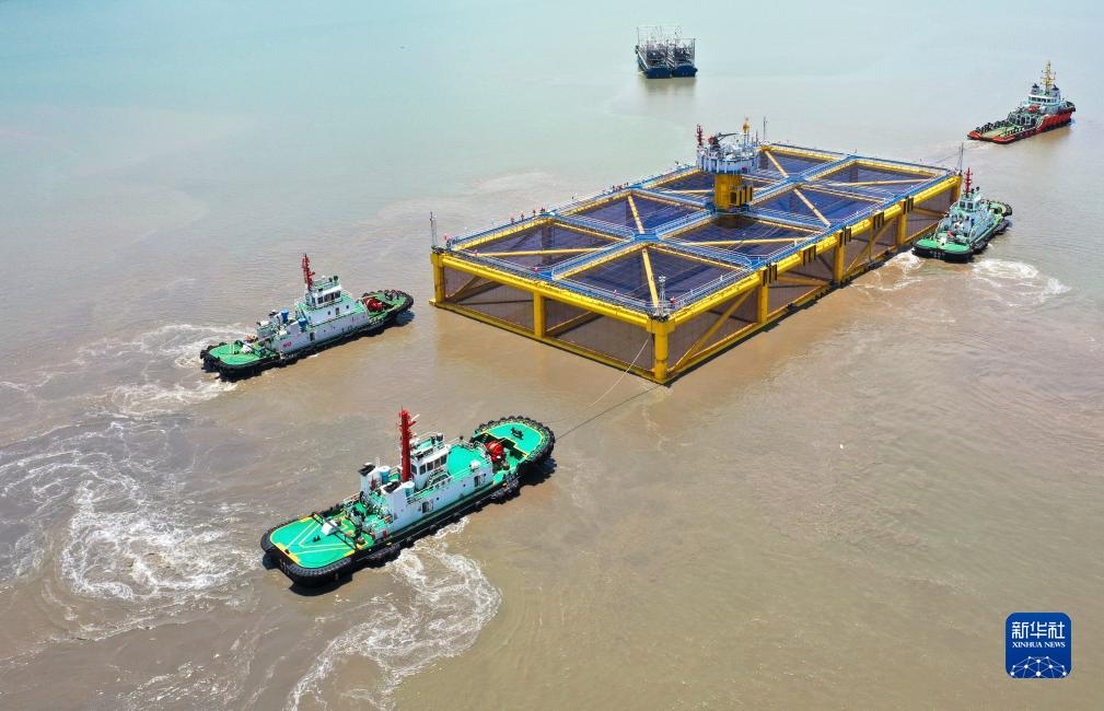 寧德制造的大黃魚(yú)深海養殖平臺“寧德1號”拖航出海,駛向霞浦北礵島海域養殖區(無(wú)人機照片,6月27日攝)。該平臺裝配自動(dòng)投喂、氣溫海水監測、信息化自動(dòng)控制等先進(jìn)系統,將引領(lǐng)寧德大黃魚(yú)養殖由內澳走向深海。