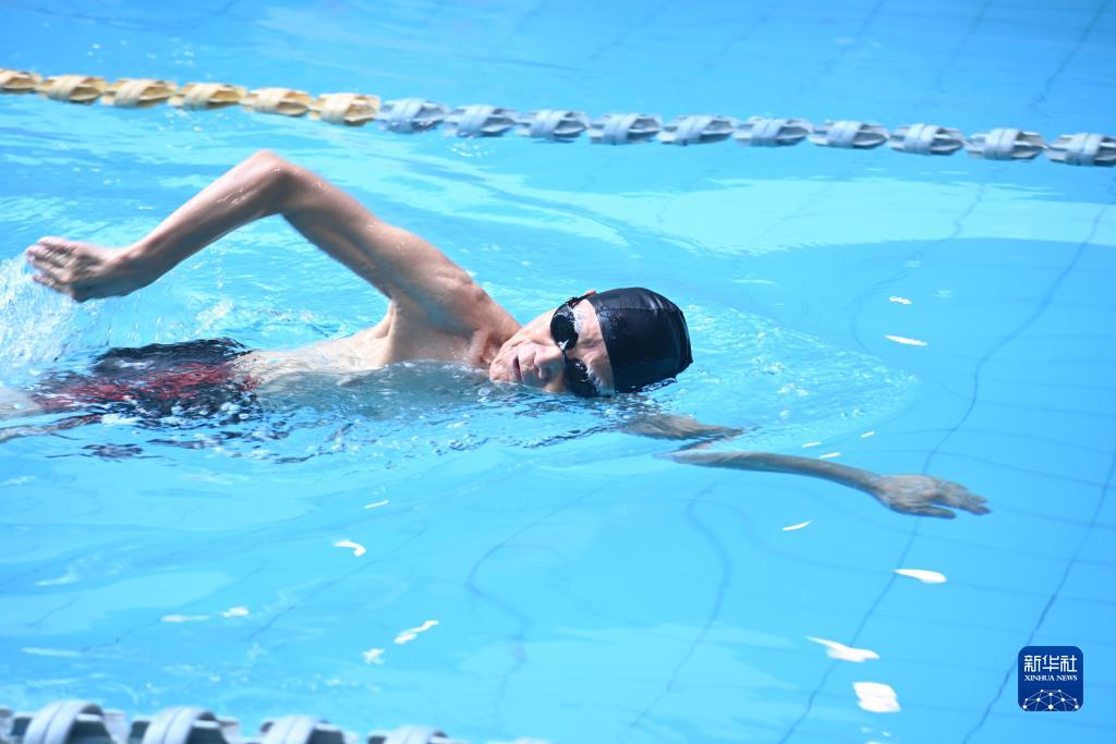 河北廊坊三河市燕達金色年華健康養護中心入住老人在游泳館游泳(7月20日攝)。