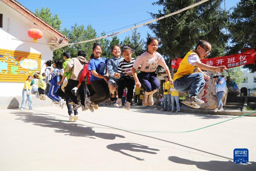 7月21日,在甘肅省定西市安定區內官營(yíng)鎮東岳村,孩子們參加鄉村夏令營(yíng)的跳繩比賽。