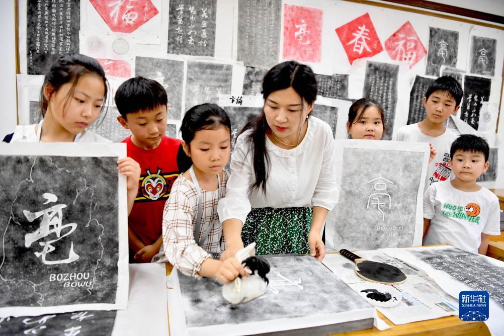 7月20日,在安徽省亳州市文化館,孩子們在老師的指導下學(xué)習拓片技藝。