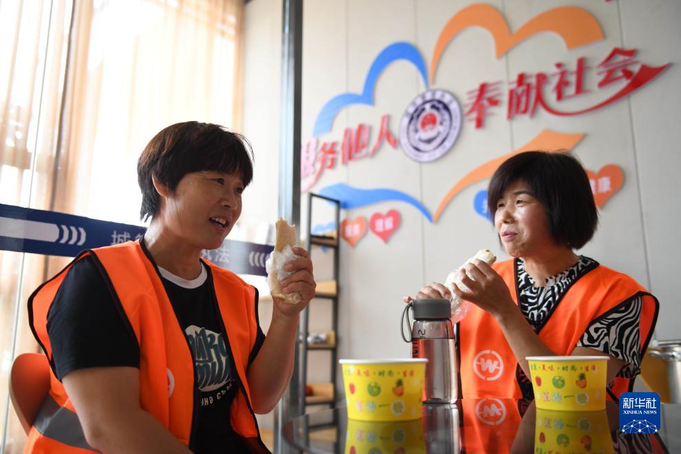 7月21日,山東省臨沂市郯城縣環(huán)衛工在“愛(ài)心驛站”就餐納涼。