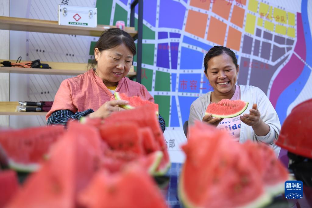 7月21日,山東省臨沂市郯城縣建筑工人在“愛(ài)心驛站”吃瓜消暑。