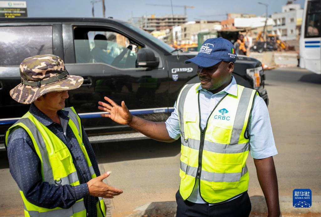 5月13日,蘇信(右)在塞內加爾達喀爾快速公交項目建設工地與同事交流。