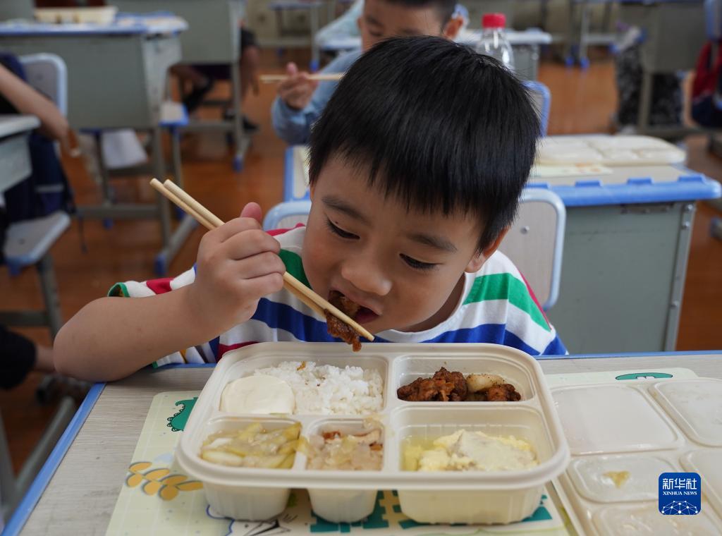7月19日,在萬(wàn)里城實(shí)驗學(xué)校,小學(xué)生愛(ài)心暑托班“新業(yè)態(tài)新就業(yè)群體子女專(zhuān)班”的孩子們在吃午餐。