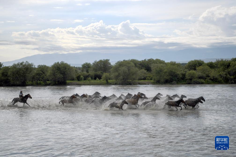 這是7月17日在新疆伊犁哈薩克自治州昭蘇縣濕地公園景區拍攝的“天馬浴河”景觀(guān)(無(wú)人機照片)。