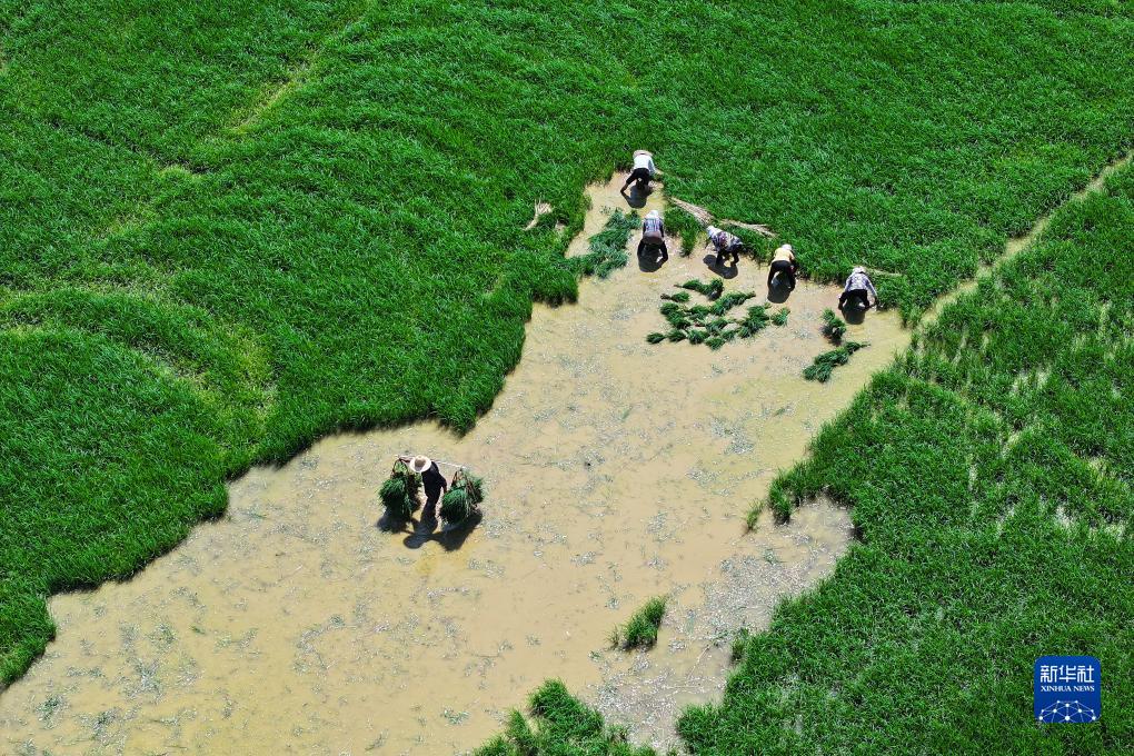 7月22日,湖南省衡陽(yáng)市衡東縣高湖鎮,村民為晚稻起秧(無(wú)人機照片)。