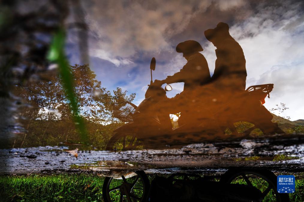 7月20日,兩名亞洲象監測隊隊員騎著(zhù)摩托車(chē)在山路上穿行。