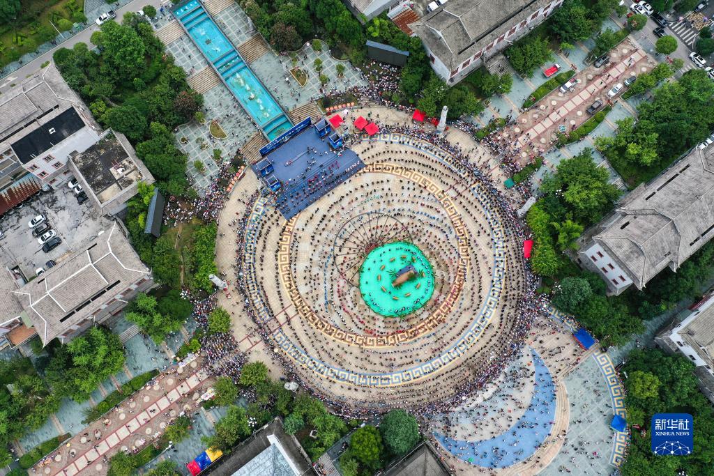 7月23日,人們在貴州劍河仰阿莎文化節上跳苗族水鼓舞(無(wú)人機拍攝)。