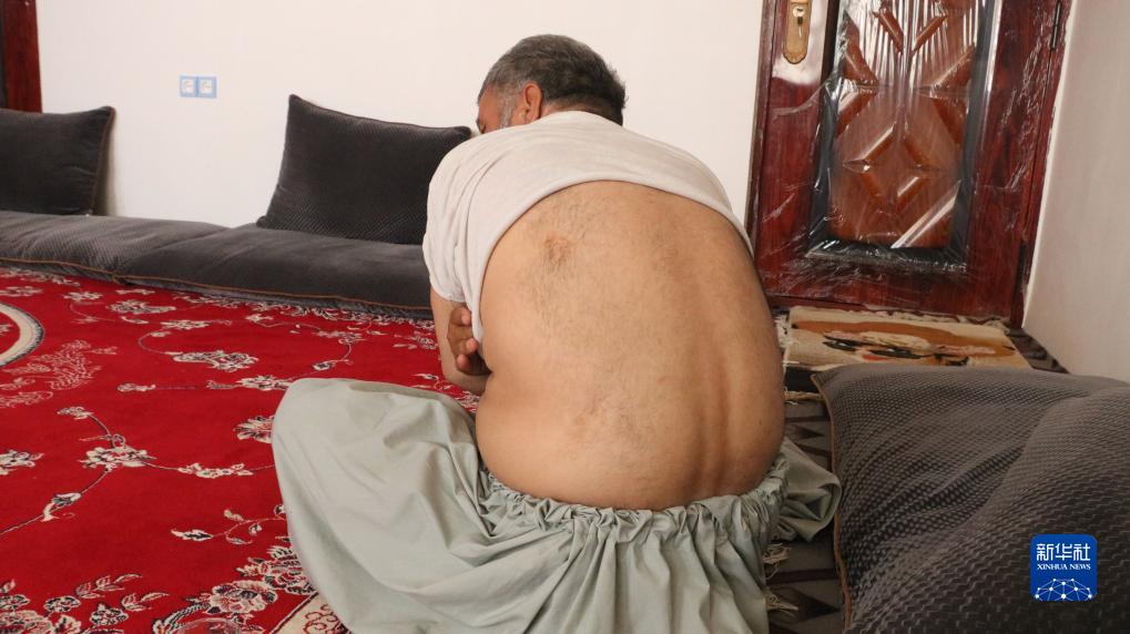 7月15日,在阿富汗赫拉特省赫拉特市沙提爾堡村,一名村民展示其在2001年美軍集束炸彈襲擊中留下的傷疤。