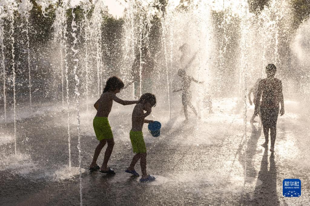7月23日,兒童在希臘雅典一處噴泉玩水。