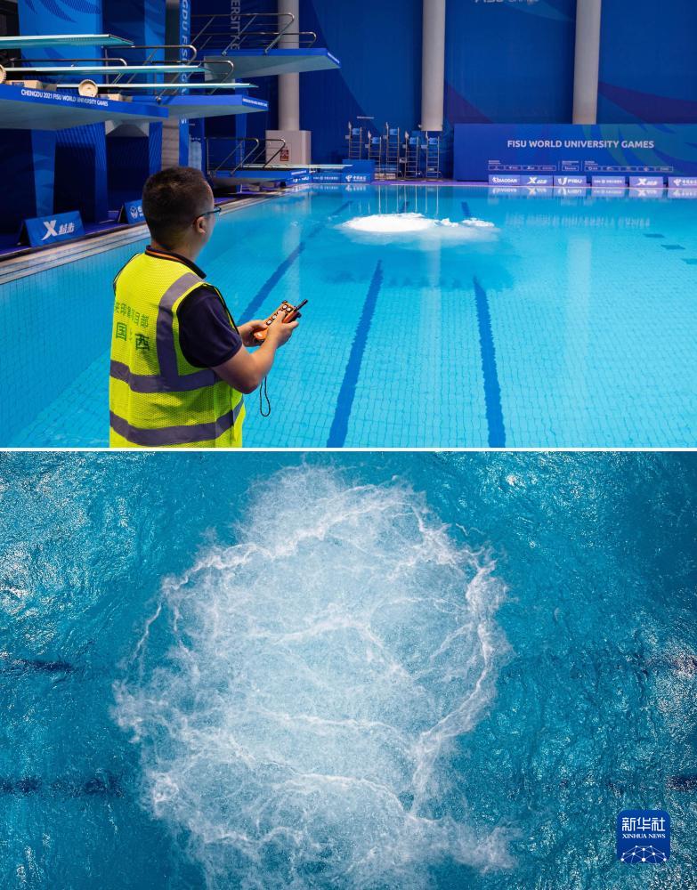這是一張拼版照片。上圖為:7月22日,在簡(jiǎn)陽(yáng)文體中心游泳館,中國華西四川機司東來(lái)印象(簡(jiǎn)陽(yáng)文體中心)項目工作人員正在操作池底安全氣墊系統。下圖為:池底安全氣墊系統效果展示。該系統為確保跳水運動(dòng)員安全,在氣體釋放時(shí)形成上升水流和側向水流增加水體的柔軟度和彈性,減緩人體在水中的降落速度,防止對運動(dòng)員身體的傷害。