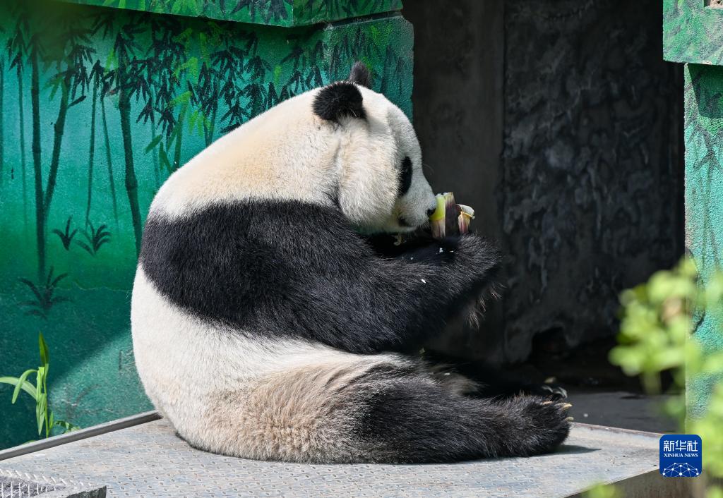 7月24日,在天津動(dòng)物園熊貓館,大熊貓“喜樂(lè )”在吃竹筍。