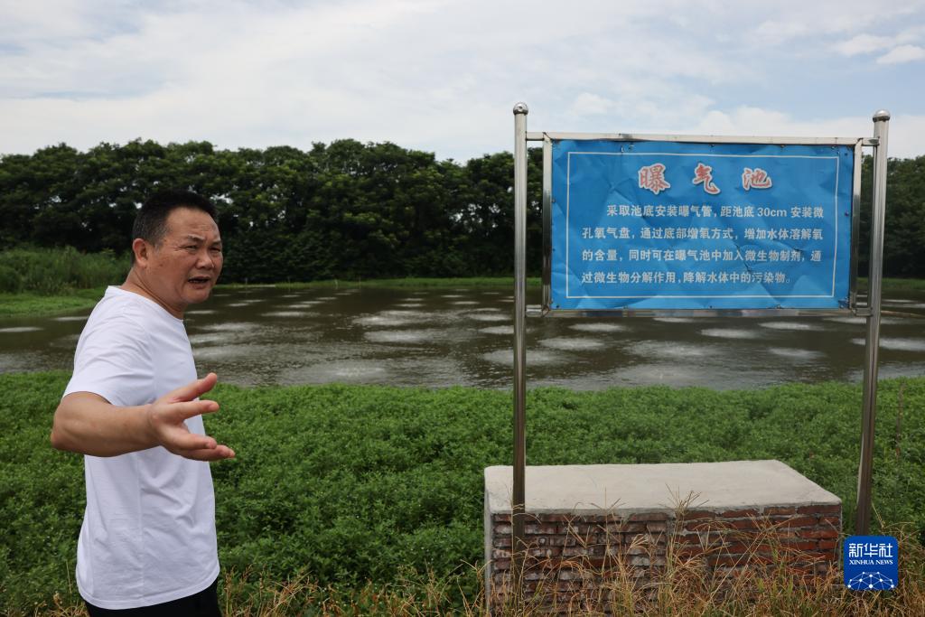7月10日,謝永宏在湖南省益陽(yáng)市大通湖區河壩鎮沙堡洲村一處牛蛙養殖基地,介紹由他們設計的“三池兩壩”養殖尾水處理設施。大通湖地處洞庭湖腹地,被稱(chēng)作“洞庭之心”。新華社記者 金立旺 攝