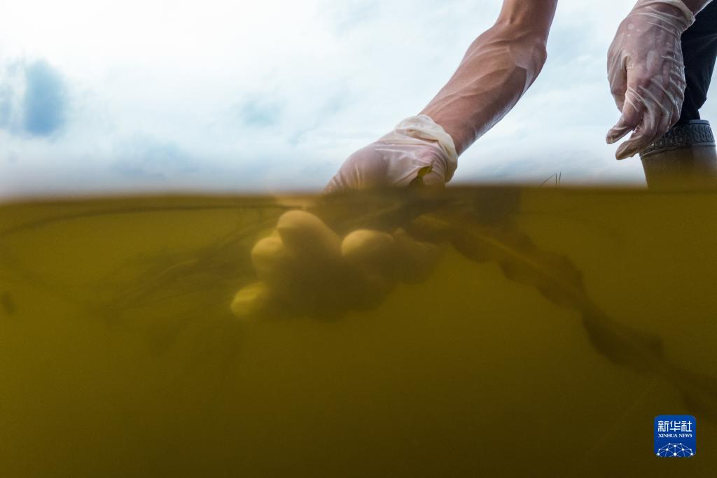 7月9日,中國科學(xué)院洞庭湖濕地生態(tài)系統觀(guān)測研究站科研人員巢傳鑫博士在湖南東洞庭湖國家級自然保護區查看種植的沉水植物生長(cháng)情況。新華社記者 周荻瀟 攝