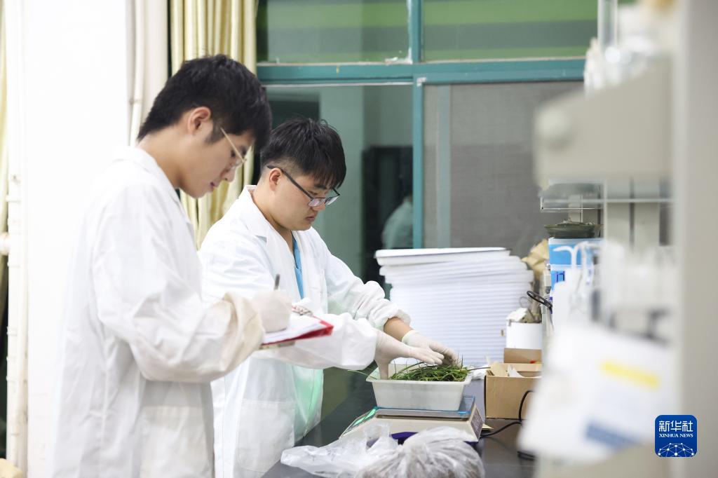 7月9日,科研人員在位于湖南省岳陽(yáng)市的中國科學(xué)院洞庭湖濕地生態(tài)系統觀(guān)測研究站內將采集的苔草樣本稱(chēng)重。新華社記者 薛宇舸 攝