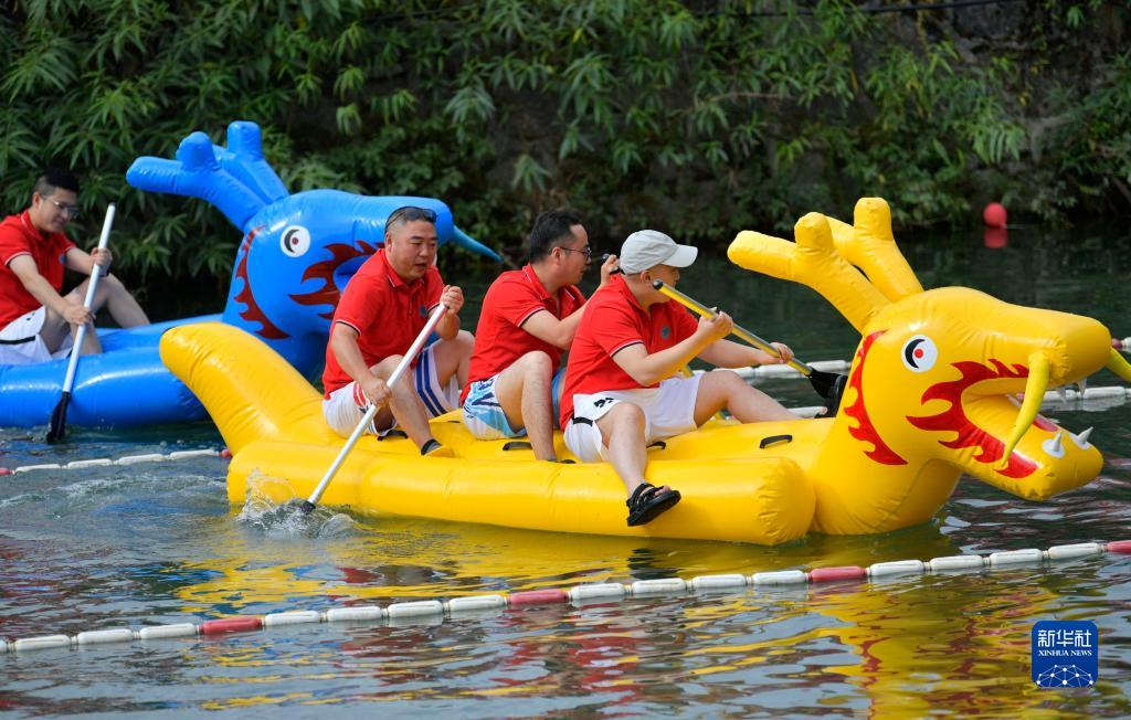 7月24日,在湖北省宣恩縣高羅鎮板寮村,村民參與“趣味龍舟”比賽。