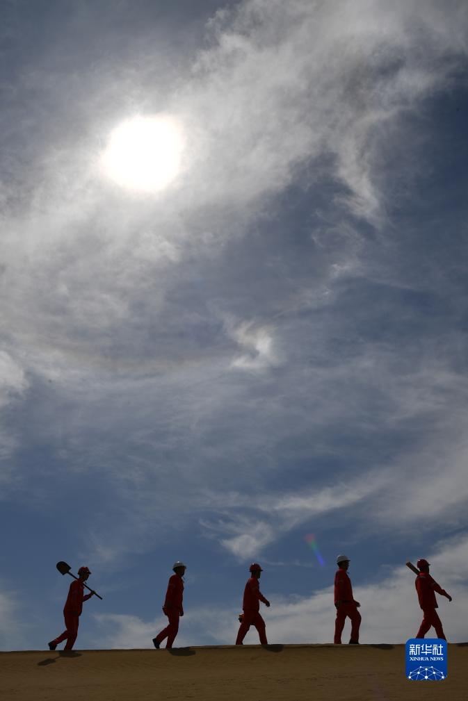巡線(xiàn)隊員在巡線(xiàn)時(shí)穿越沙漠區域(7月23日攝)。