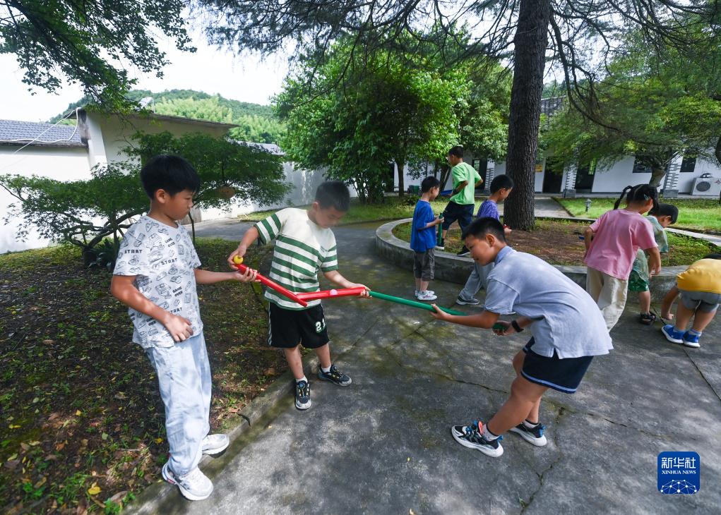 7月25日,在諸暨市馬劍鎮上和村的侯門(mén)山鄉村圖書(shū)館,暑托班的孩子們在玩游戲。