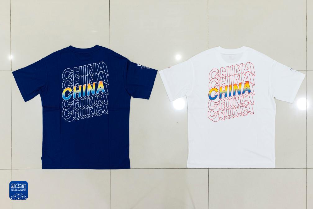 這是7月24日拍攝的第31屆世界大學(xué)生夏季運動(dòng)會(huì )中國代表團成員配發(fā)裝備中的短T恤衫。