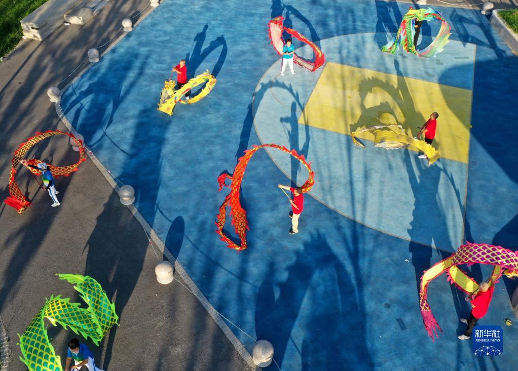 7月25日,市民在白溝新城一處“口袋公園”舞龍(無(wú)人機照片)。