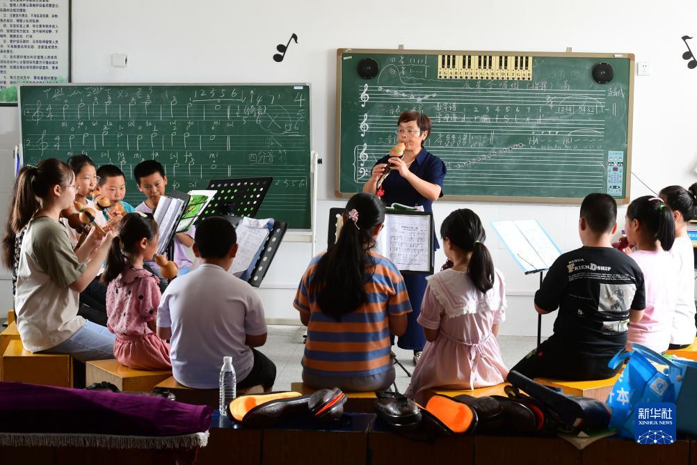 7月25日,孩子們在合肥市肥西縣紫蓬鎮中心學(xué)校少年宮學(xué)習吹奏葫蘆絲。