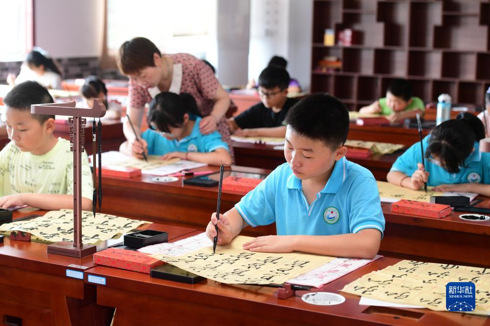 7月25日,孩子們在合肥市肥西縣紫蓬鎮中心學(xué)校少年宮練習書(shū)法。