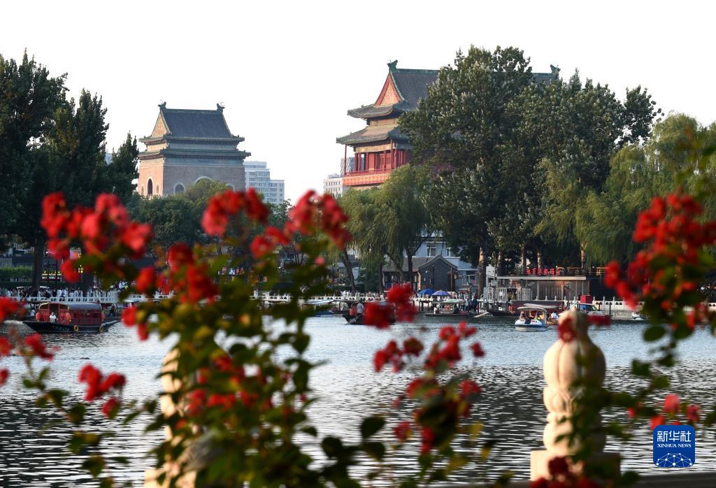 從什剎海東岸遠眺北京鐘鼓樓(7月17日攝)。鐘鼓樓位于北京中軸線(xiàn)的最北端,兩樓前后縱置,氣勢雄偉。作為元、明、清三代都城的報時(shí)中心,至今已有700多年的歷史。