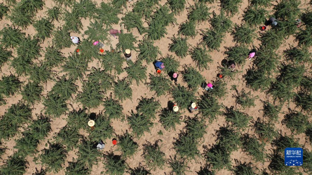 7月21日,采摘工在中衛市沙坡頭區興仁鎮中衛市杞園春枸杞種植農民專(zhuān)業(yè)合作社枸杞種植基地采摘枸杞(無(wú)人機照片)。