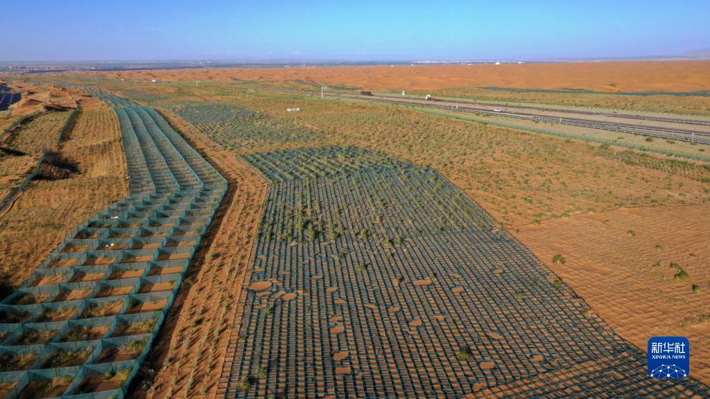 烏瑪高速青銅峽至中衛段穿越騰格里沙漠的18公里高速公路旁的草方格固沙區及防護林帶(7月21日攝,無(wú)人機照片)。寧夏中衛市是草方格沙障的起源地,該技術(shù)由中國科學(xué)院沙坡頭沙漠研究試驗站同中衛鐵路固沙林場(chǎng)職工、當地群眾經(jīng)過(guò)多年的探索和實(shí)踐總結而成。