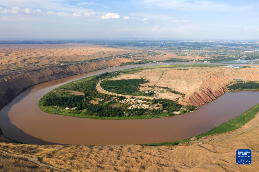 7月19日拍攝的植被覆蓋的中衛市黃河沿岸(無(wú)人機照片)。