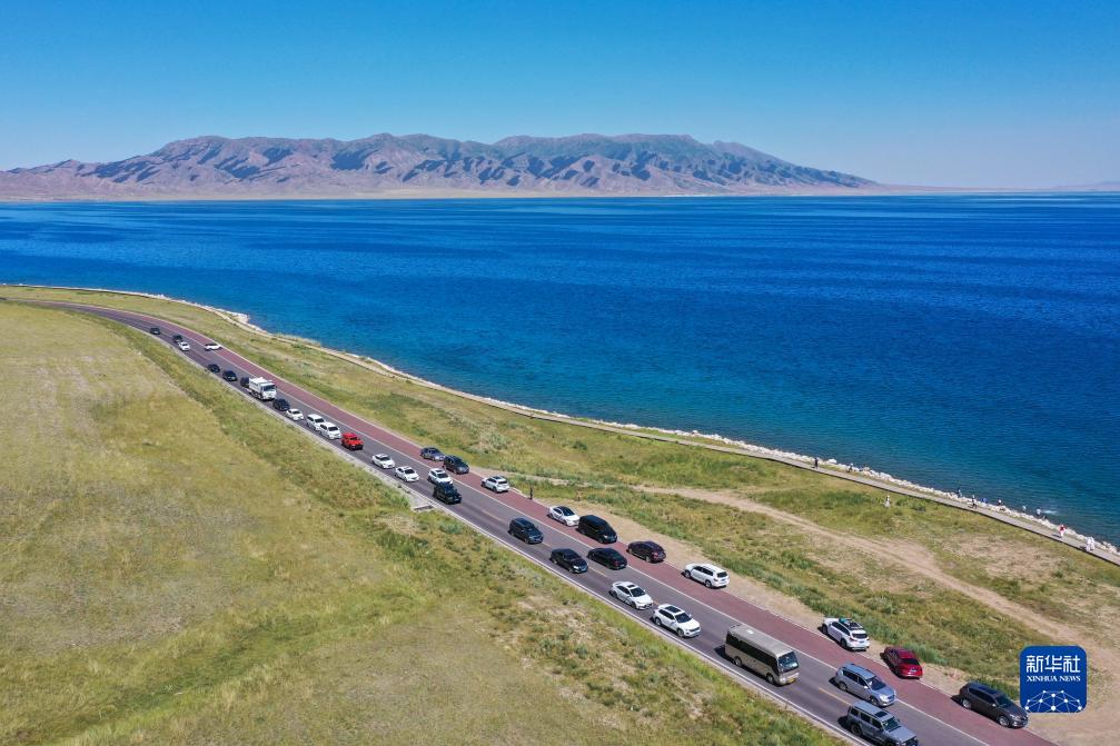7月25日,車(chē)輛排隊進(jìn)入新疆賽里木湖景區(無(wú)人機照片)。