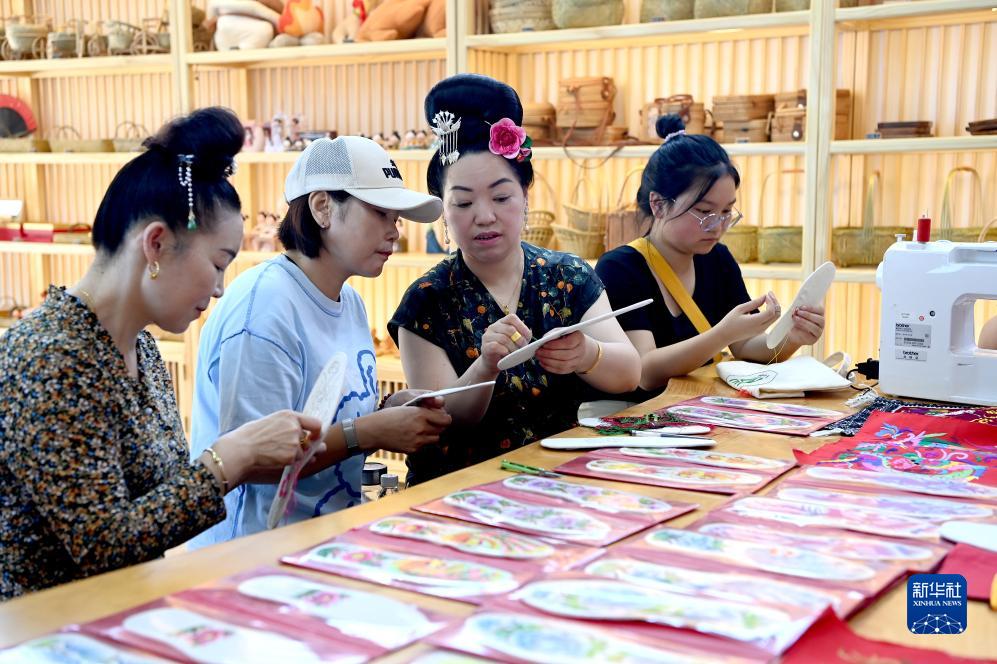 在陜西省漢中市留壩縣老街內的一家手工店鋪里,當地婦聯(lián)邀請來(lái)自鎮巴縣的苗繡老師(右二)為當地婦女及游客教授苗繡(7月25日攝)。