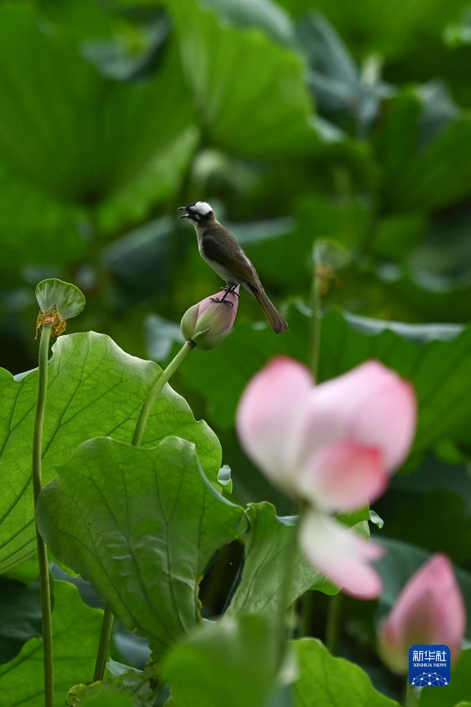 7月25日,一只白頭鵯站立在西湖景區一朵待放的荷花上。