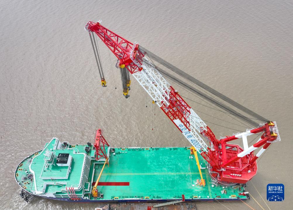 7月25日在振華重工啟東海工碼頭拍攝的4000噸全回轉起重船“海峰2001”(無(wú)人機照片)。