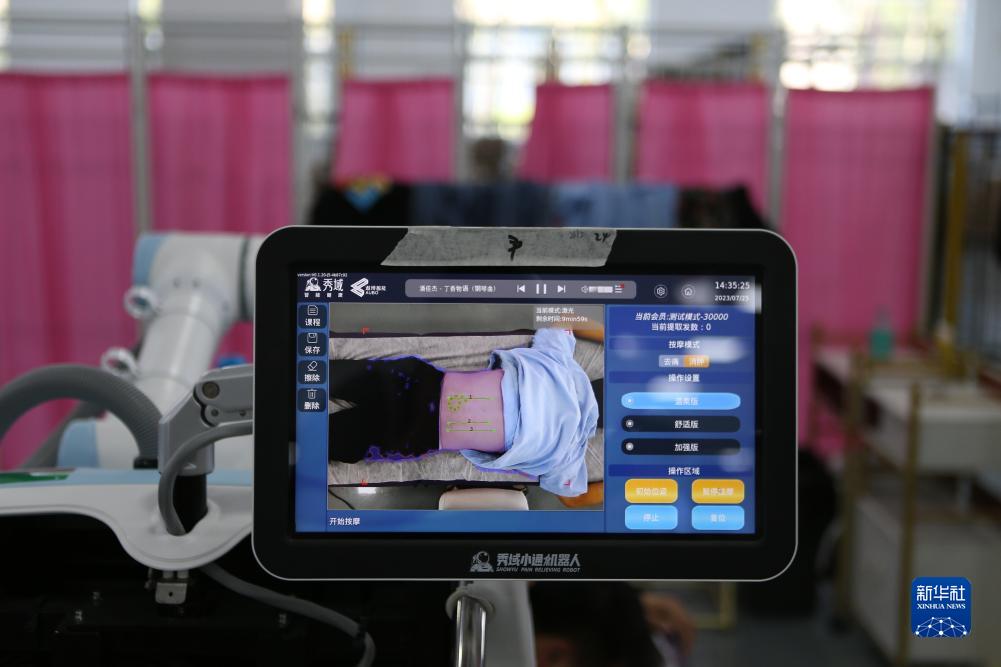 7月25日,在位于淄博市臨淄區的遨博(山東)智能機器人有限公司,一名男士在體驗該公司開(kāi)發(fā)的康復理療機器人。