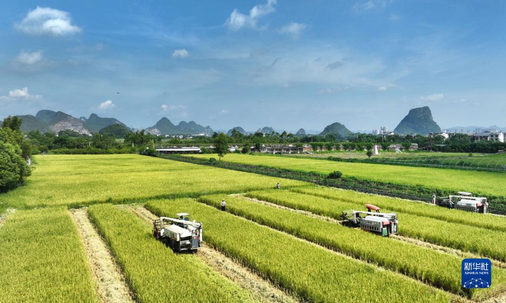 柳州市柳江區是廣西重要的糧食生產(chǎn)基地之一。連日來(lái),柳江區種植的12.2萬(wàn)畝早稻陸續進(jìn)入成熟收獲期,當地農機部門(mén)組織收割機保障早稻收割的同時(shí),還通過(guò)開(kāi)展水稻機收減損技能比武等方式,引導廣大農民和農機手在生產(chǎn)實(shí)踐中精操作、比技能,保障夏糧豐收。新華社發(fā)(黎寒池 攝)