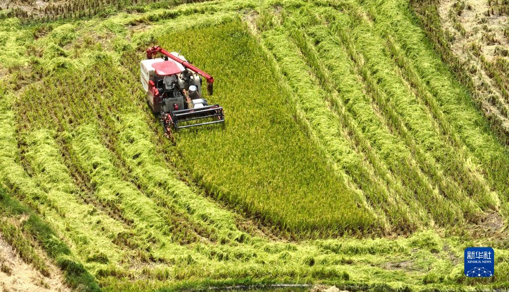 7月25日,在柳州市柳江區穿山鎮林寺村,農民駕駛收割機收割早稻(無(wú)人機照片)。新華社發(fā)(黎寒池 攝)