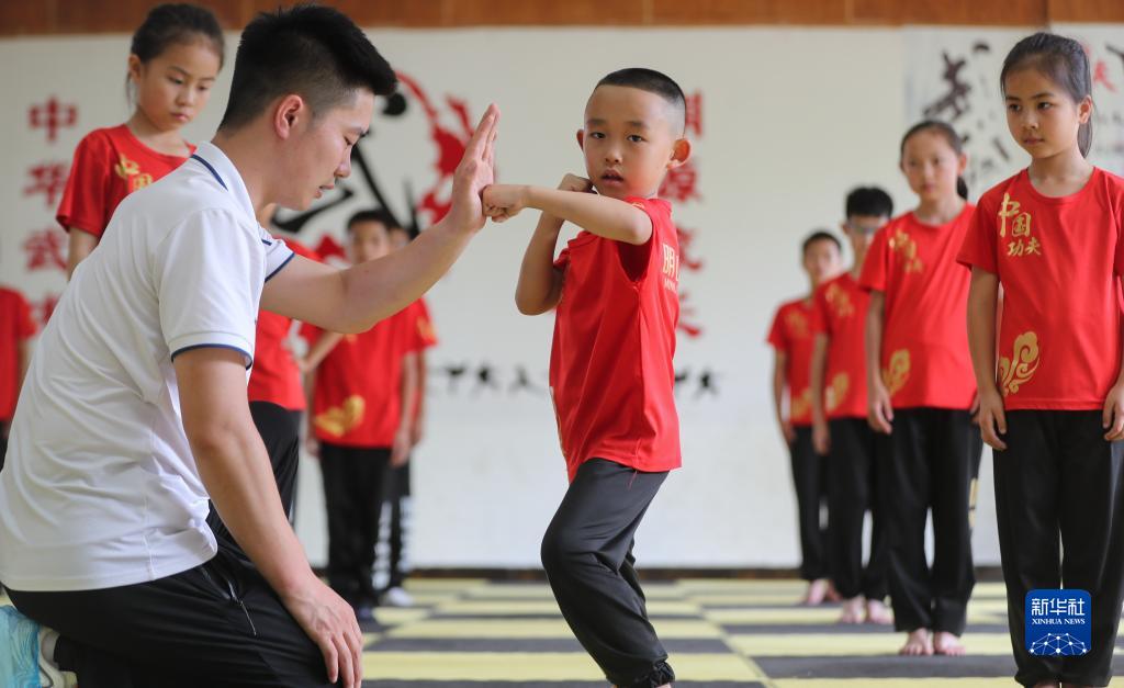 7月25日,在貴州省開(kāi)陽(yáng)縣一家武術(shù)培訓中心,孩子們在老師的指導下學(xué)習武術(shù)基本動(dòng)作。新華社發(fā)(袁福洪 攝)