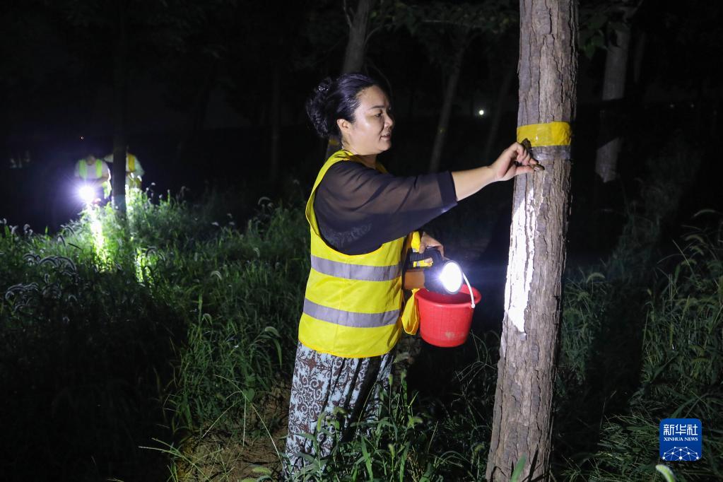 7月24日晚,在寶豐縣鬧店鎮連店村一處林下金蟬養殖基地,工作人員在采收金蟬。新華社發(fā)(何五昌攝)