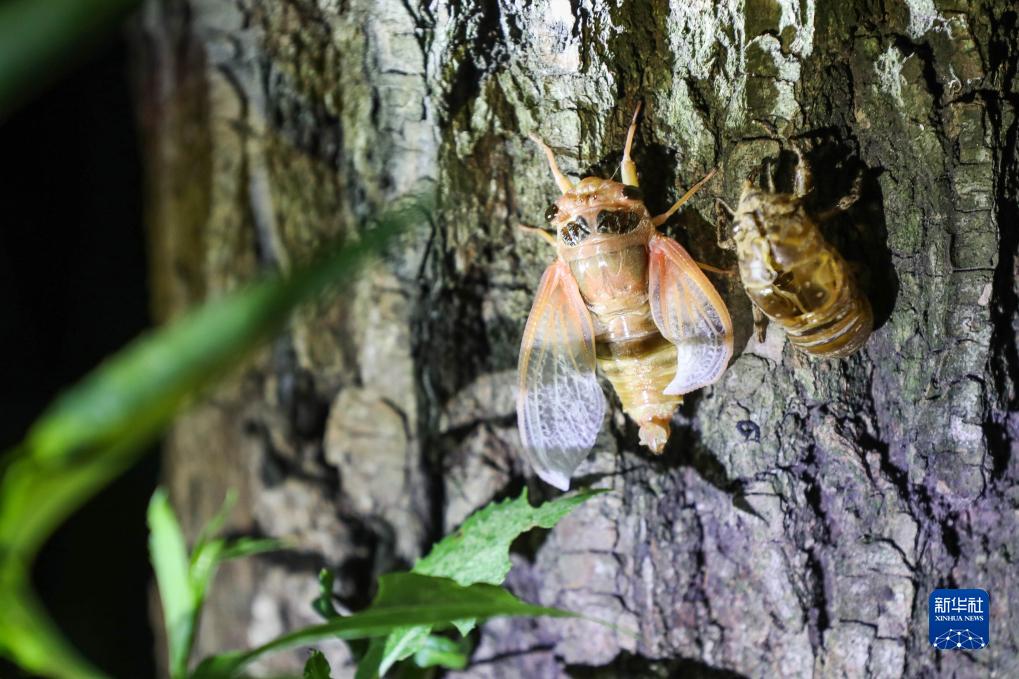 7月24日晚在寶豐縣鬧店鎮連店村一處林下金蟬養殖基地拍攝的金蟬。新華社發(fā)(何五昌攝)