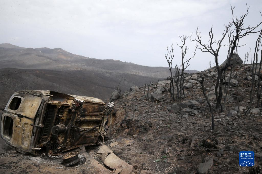 這是7月25日在阿爾及利亞貝賈亞省拍攝的被野火燒毀的車(chē)輛。