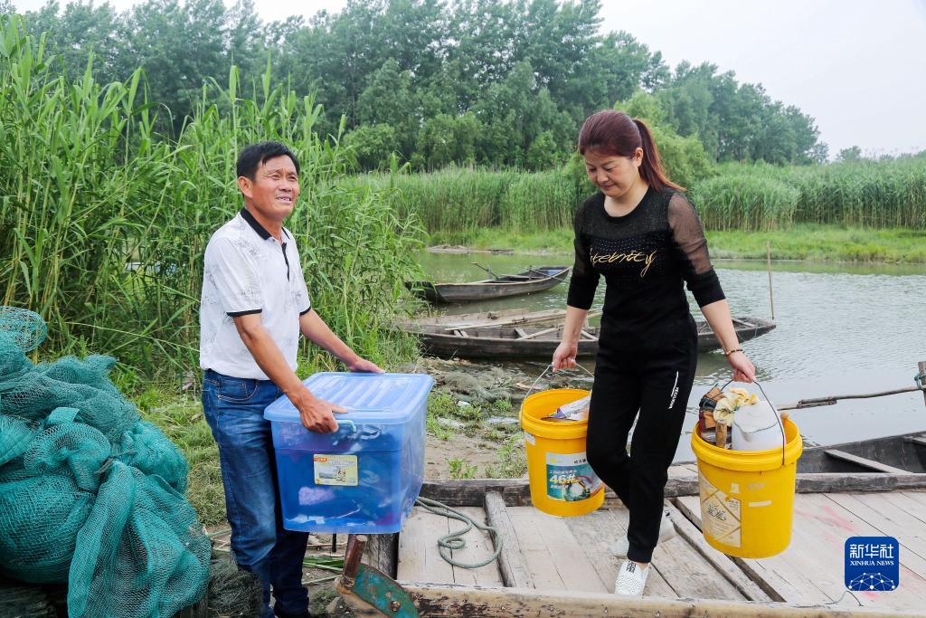 在馬鞍山薛家洼,陳蘭香(右)和丈夫張周華搬遷上岸(2019年5月15日攝)。新華社發(fā)(畢琛攝)