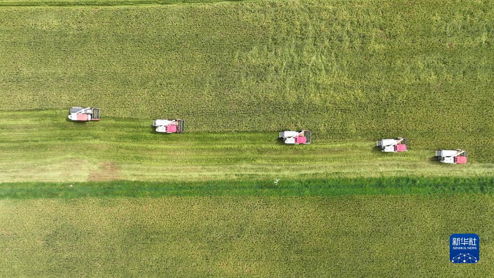 在江西省南昌市新建區聯(lián)圩鎮連前村,多臺聯(lián)合收割機在田間收割早稻(7月24日攝,無(wú)人機照片)。