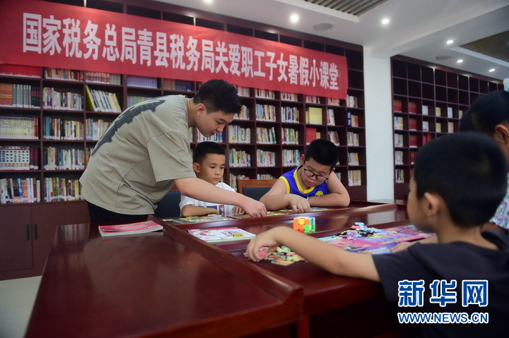 志愿者在河北青縣稅務(wù)局組織的關(guān)愛(ài)職工子女暑假小課堂上對孩子們進(jìn)行輔導。新華網(wǎng)發(fā)(張悅 攝)