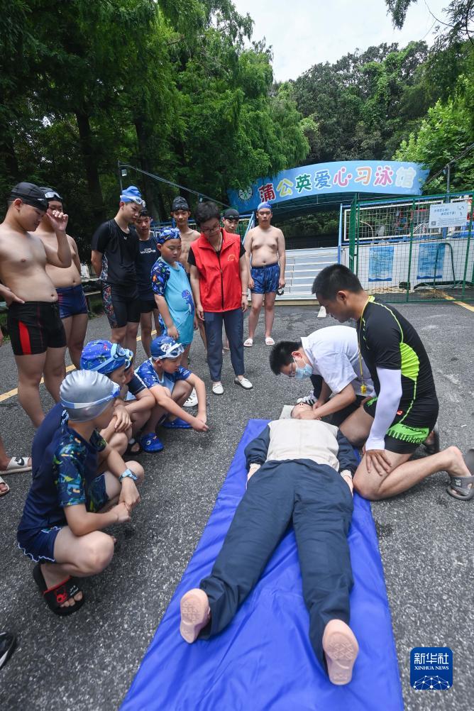 7月26日,道場(chǎng)鄉衛生院的醫生和志愿者老師在“蒲公英愛(ài)心習泳館”暑期愛(ài)心公益游泳班教孩子們心肺復蘇的規范操作步驟。