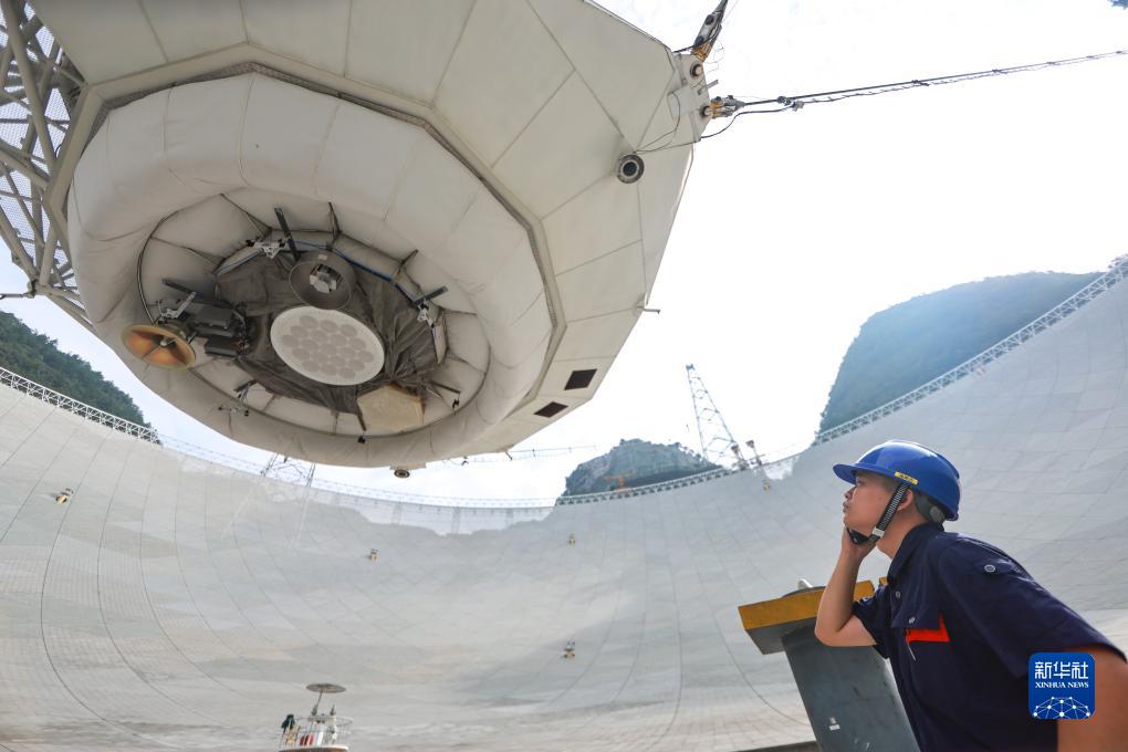 7月26日,工作人員在“中國天眼”饋源艙前(維護保養期間拍攝)。