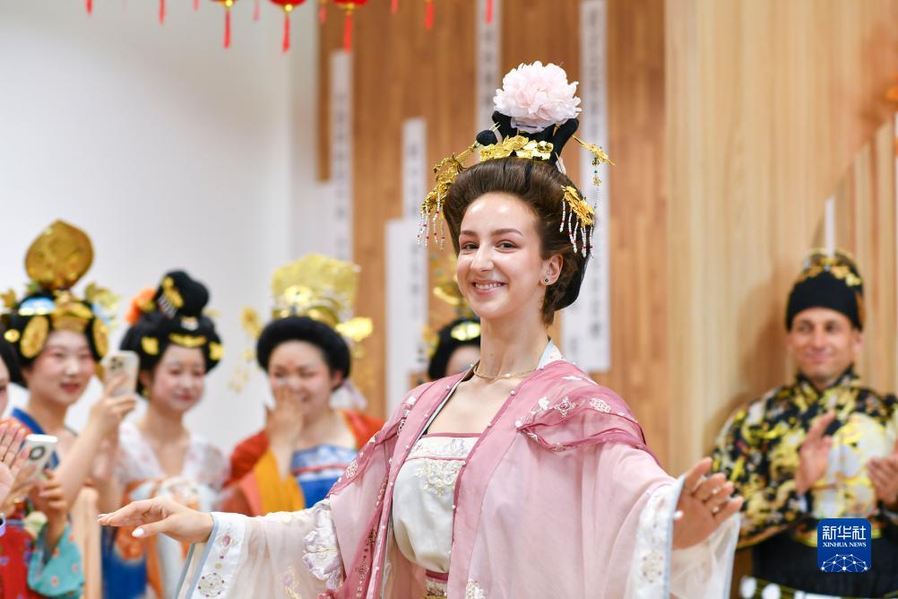 在新疆圖書(shū)館,俄羅斯青年舞蹈演員索菲婭身著(zhù)中式傳統服裝走秀(7月23日攝)。