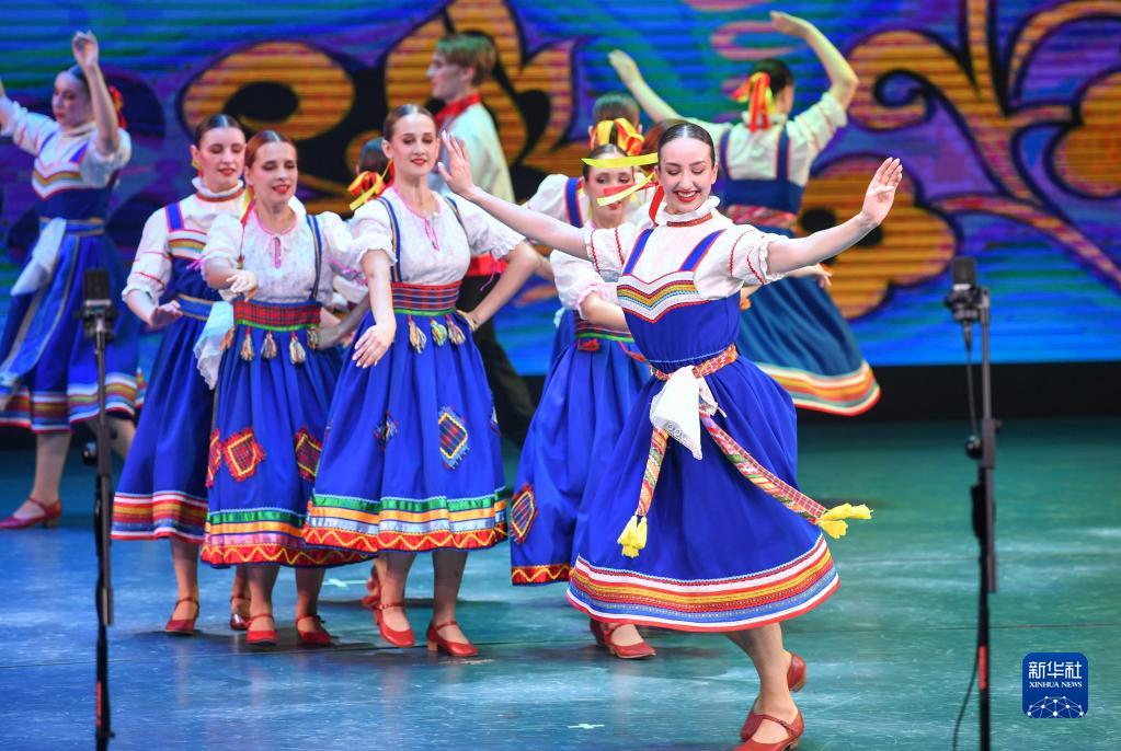 在烏魯木齊晚報劇院,索菲婭(前)和俄羅斯薩拉托夫州曙光歌舞團隊友一起,為觀(guān)眾演出歌舞專(zhuān)場(chǎng)劇目《曙光》(7月22日攝)。